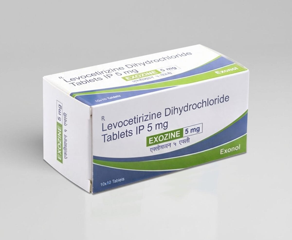 Effective Relief from Allergic Symptoms: Exozine 5mg is a trusted antihistamine formulation containing Levocetirizine Dihydrochloride I.P., designed to provide fast and long-lasting relief from allergic conditions. It works by blocking histamine—the substance responsible for allergy symptoms—helping patients breathe easier and feel better.