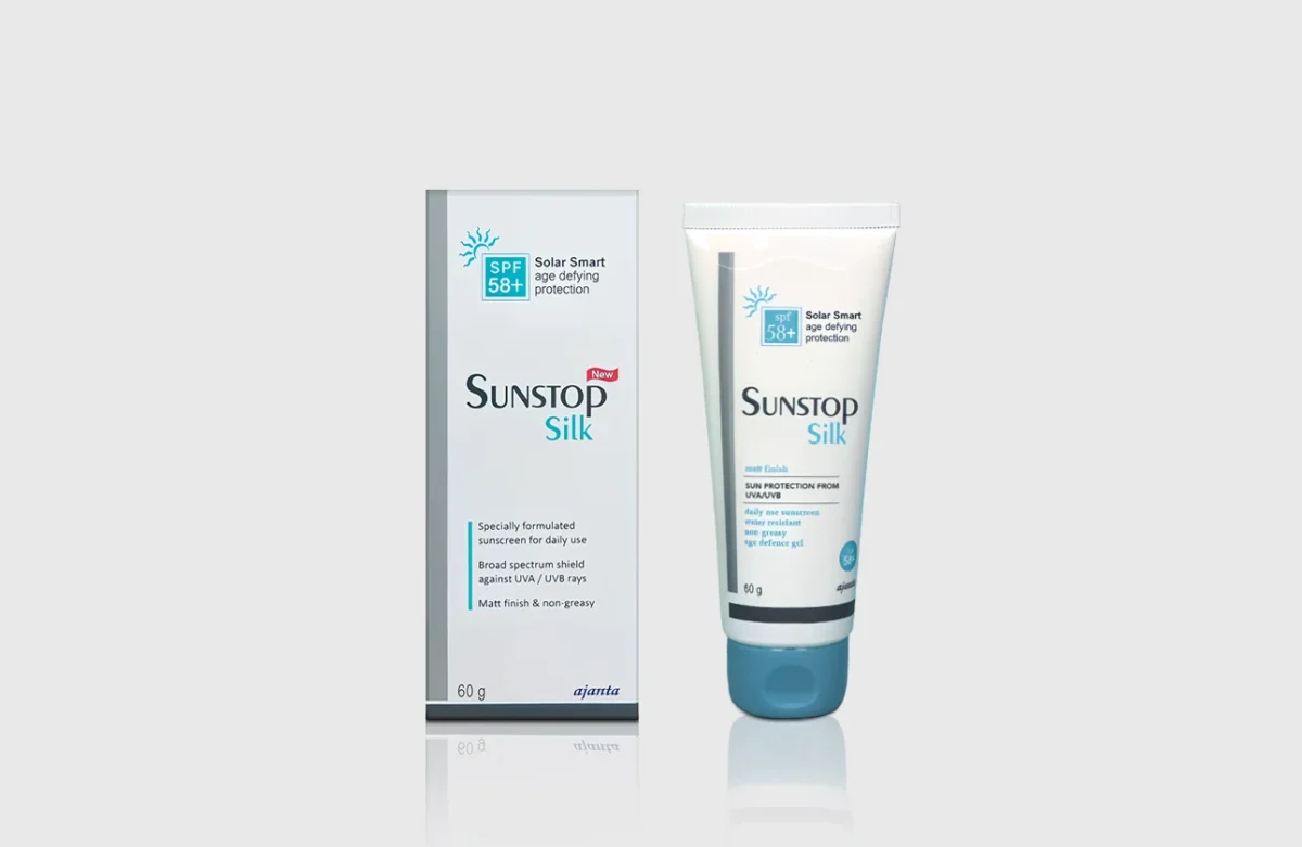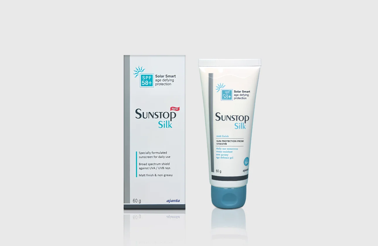 Achieve flawless sun protection with Sunstop Silk SPF 58+ 60gm, an advanced matte finish sunscreen designed for Indian skin. This broad-spectrum formula offers superior defense against harmful UVA and UVB rays, preventing tanning, sunburns, and premature aging. Its unique non-greasy, silky texture acts as a perfect makeup base, blending seamlessly without leaving a white cast. Ideal for oily and acne-prone skin, this long-lasting sunscreen gel ensures sweat and water resistance for all-day wear. Upgrade your daily skincare routine with this dermatologist-recommended shield available at a competitive sunscreen price.